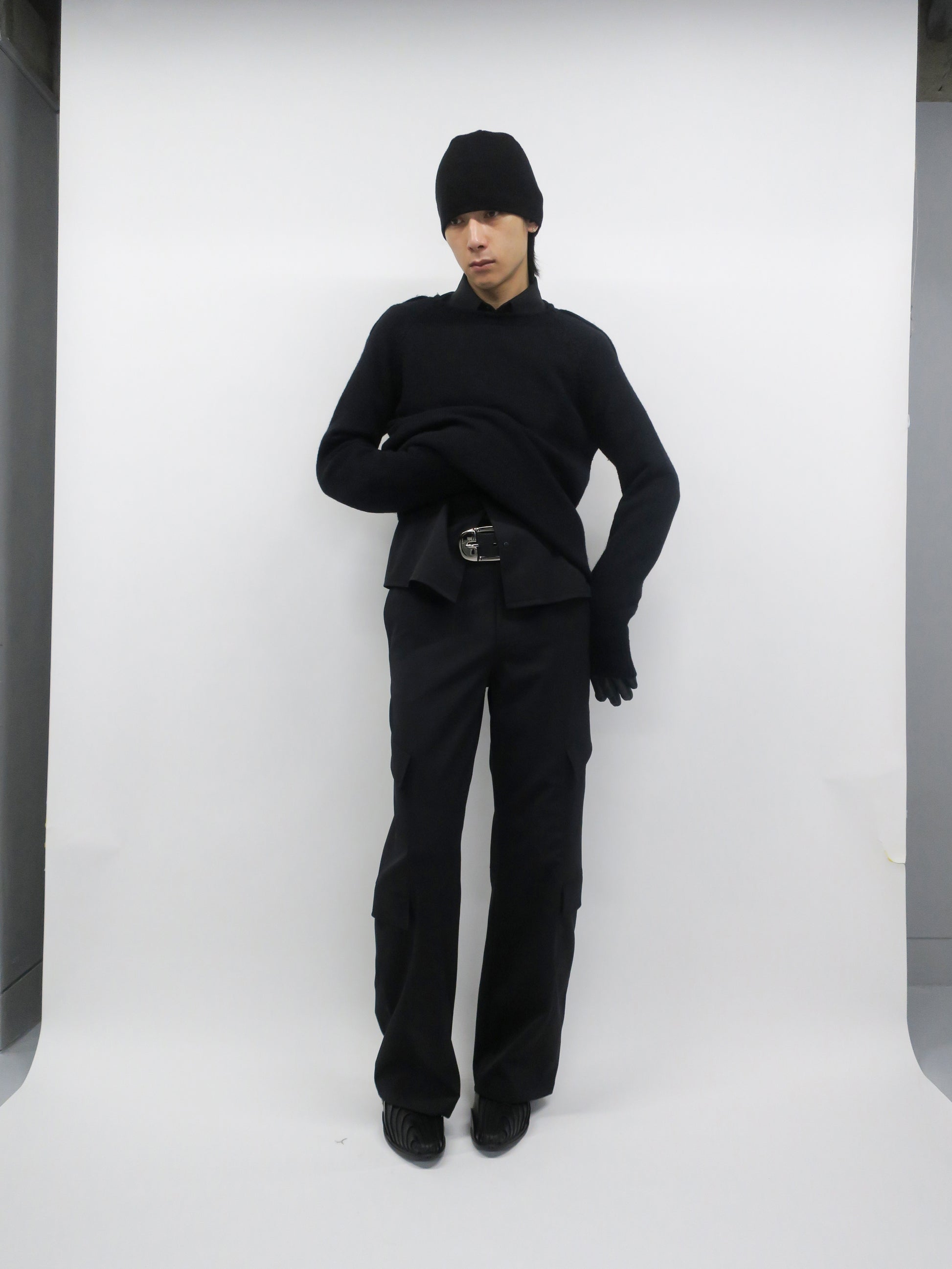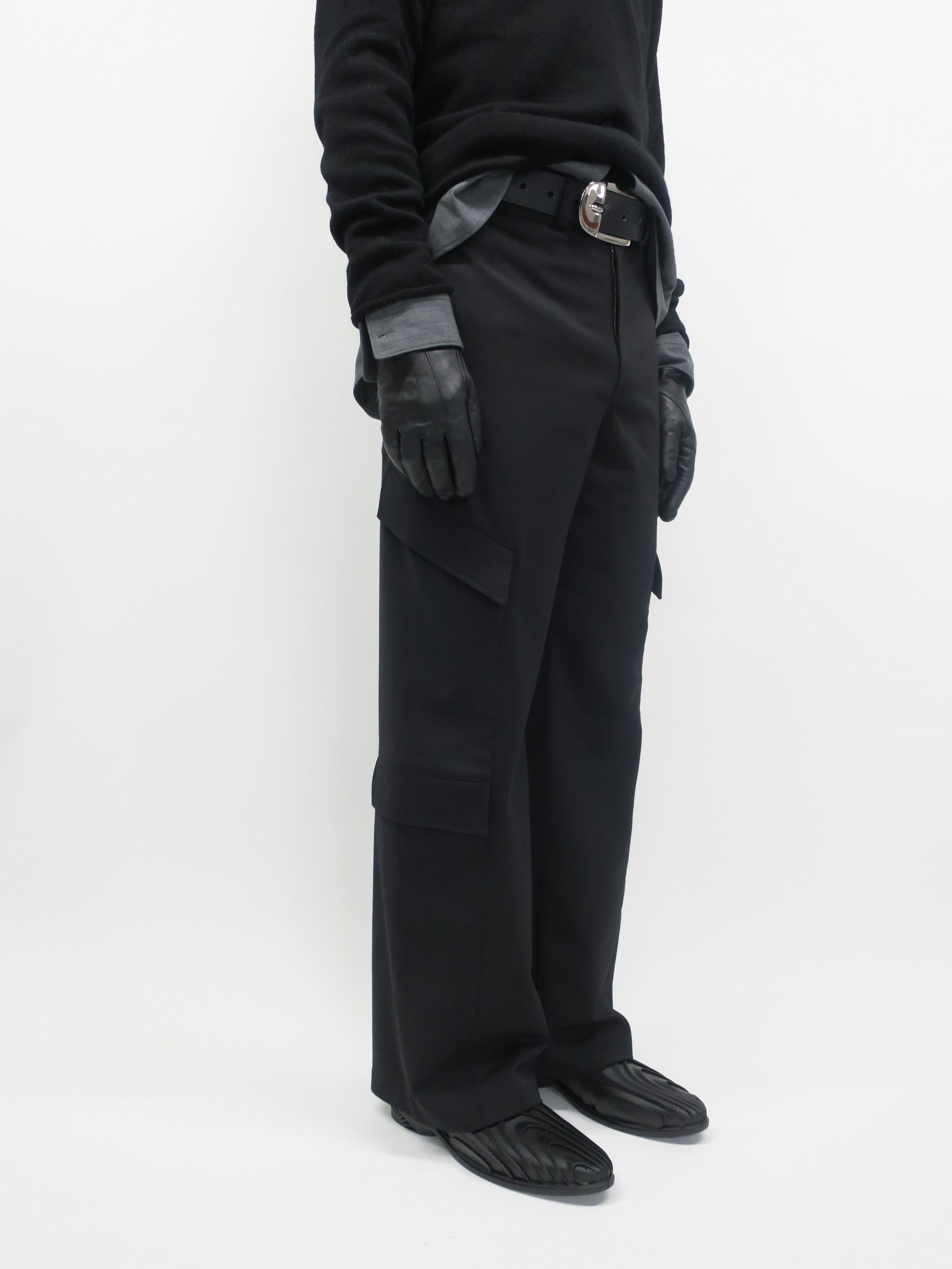 Made from durable gabardine wool fabric with a dry, crisp texture for comfortable wear. Features a clean, slim silhouette with a slight bootcut flare toward the hem. Six side pockets and a zippered back pocket.
