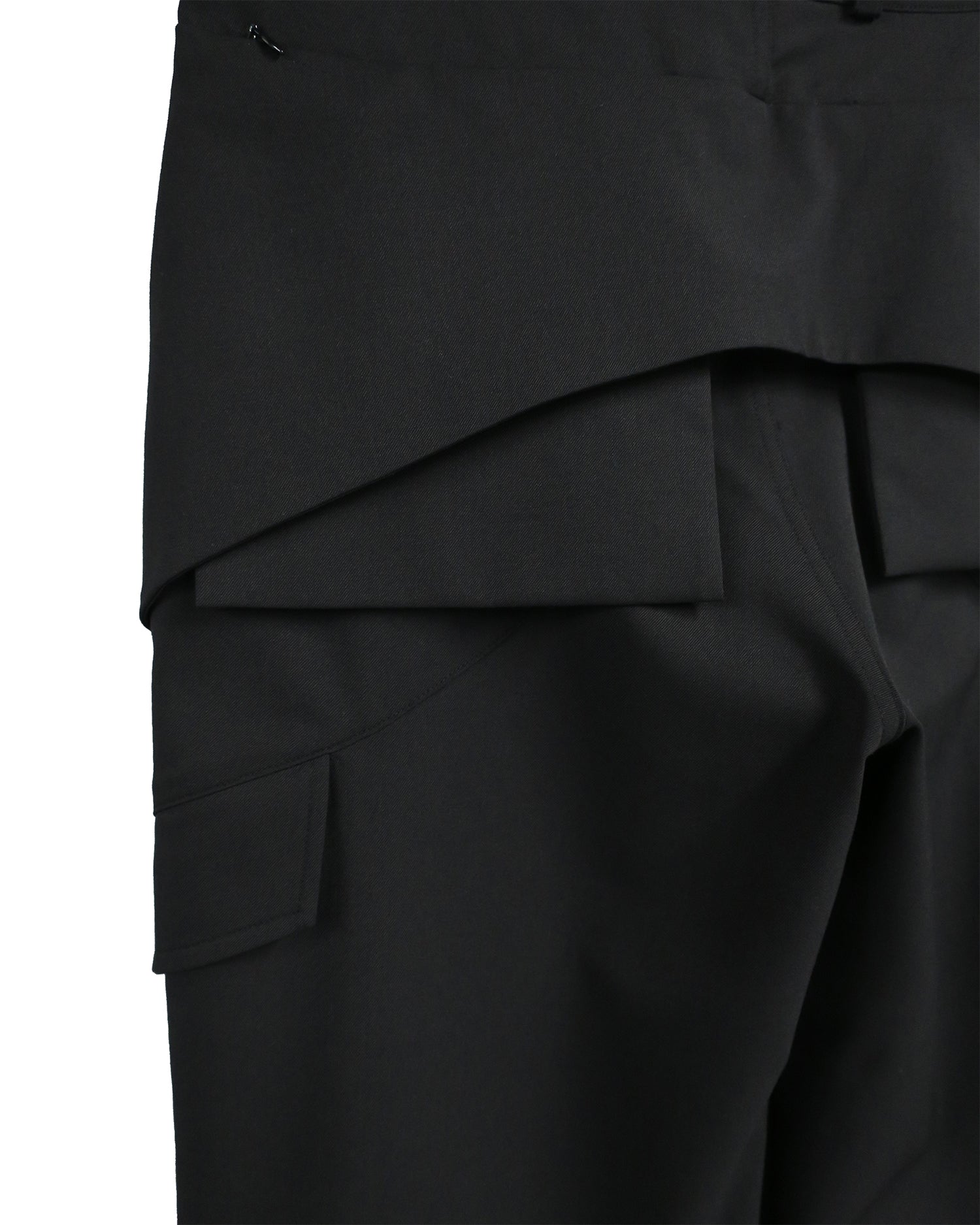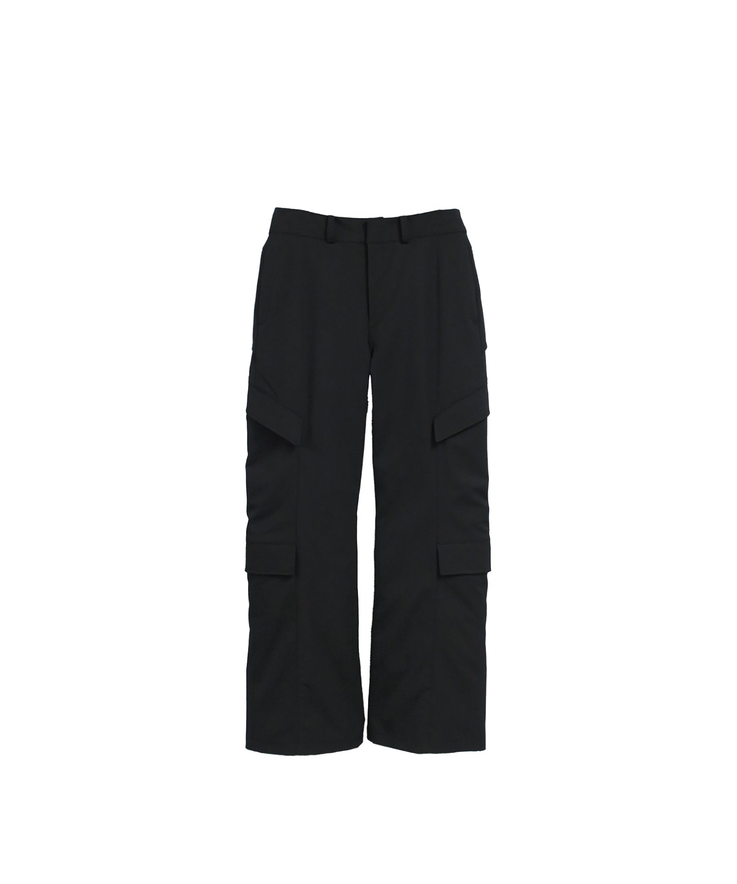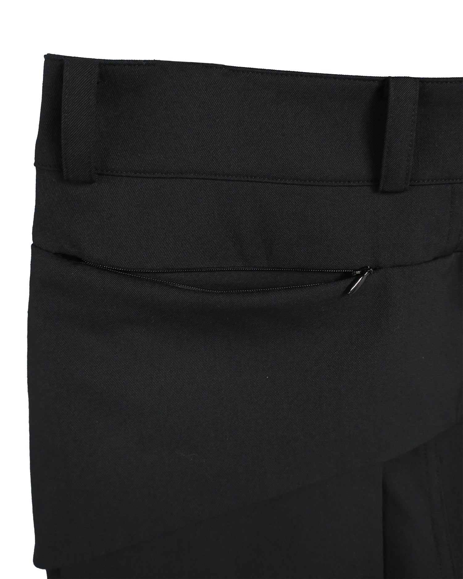 劣化しにくくドライ感とハリのある風合いで、快適な着心地のギャバジンウール生地を使用。綺麗な細身のラインで裾にかけて若干ブーツカット寄りのシルエットになっている。サイドに6つのポケット、バックにはジップ付きのポケット。