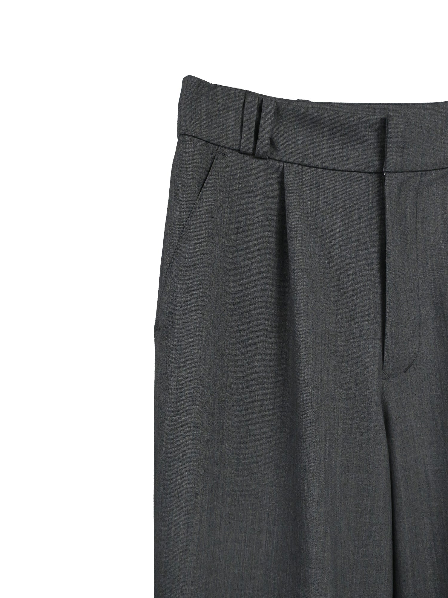 劣化しにくく適度なドライ感とハリ感を持つ、快適な着心地のギャバジンウール生地を使用。程よいリラックス感のあるワイドとストレートの中間の絶妙なシルエット。フロントのベルトループはWループになっています。