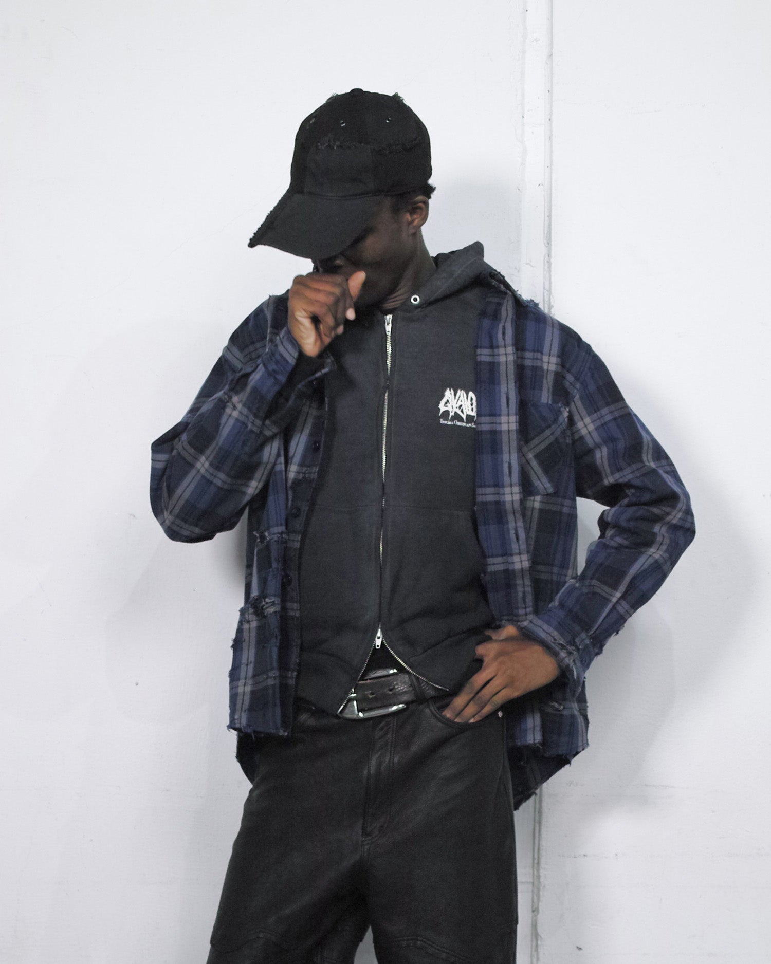 異なる4種類のデニムをパッチワークのように組み合わせたキャップ。後染めしています。
