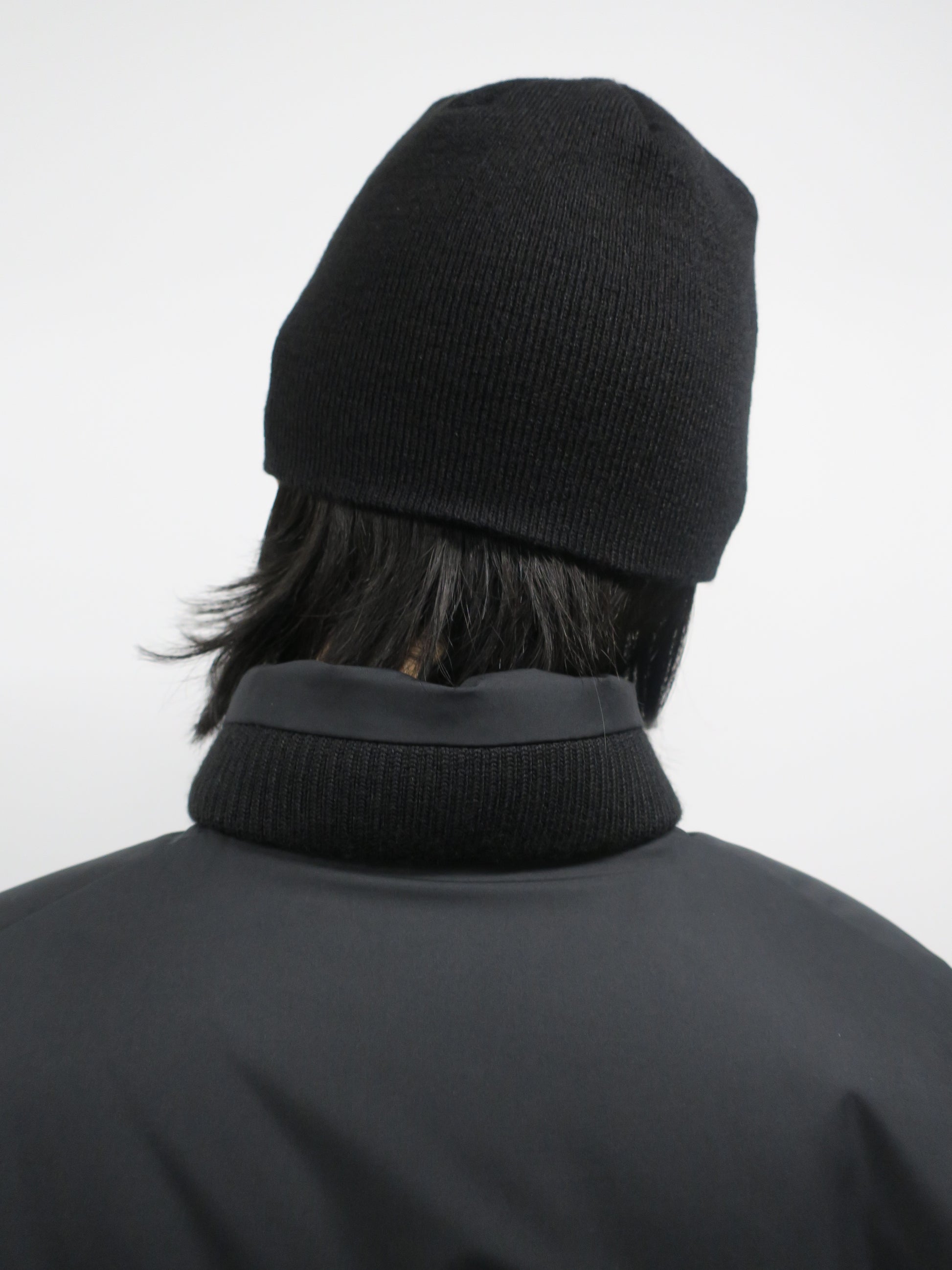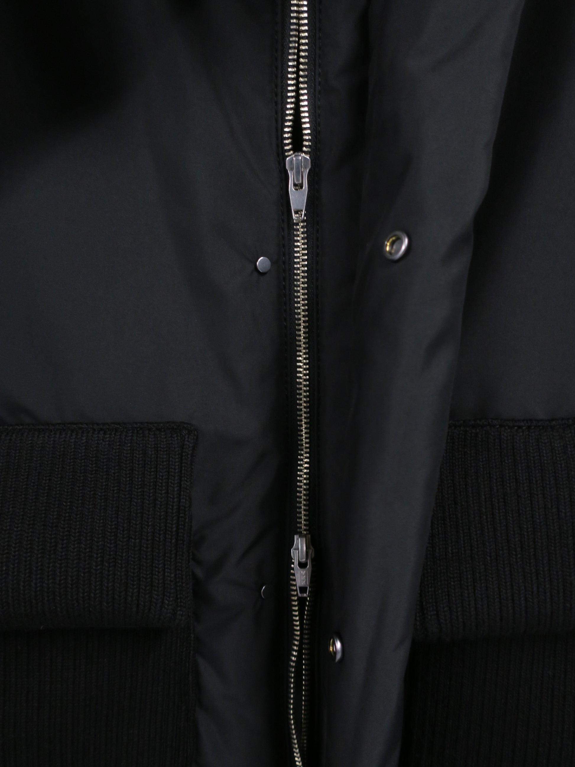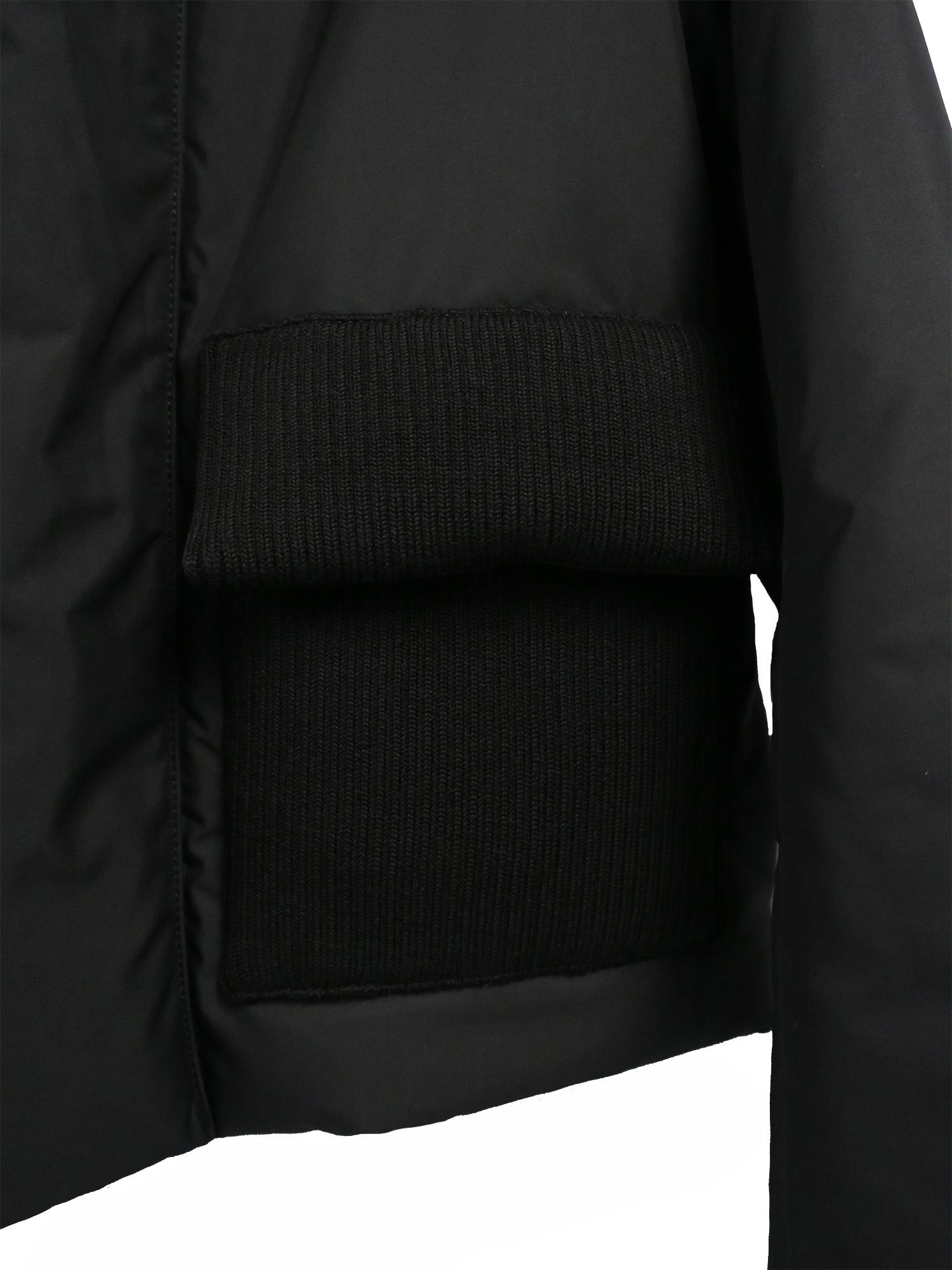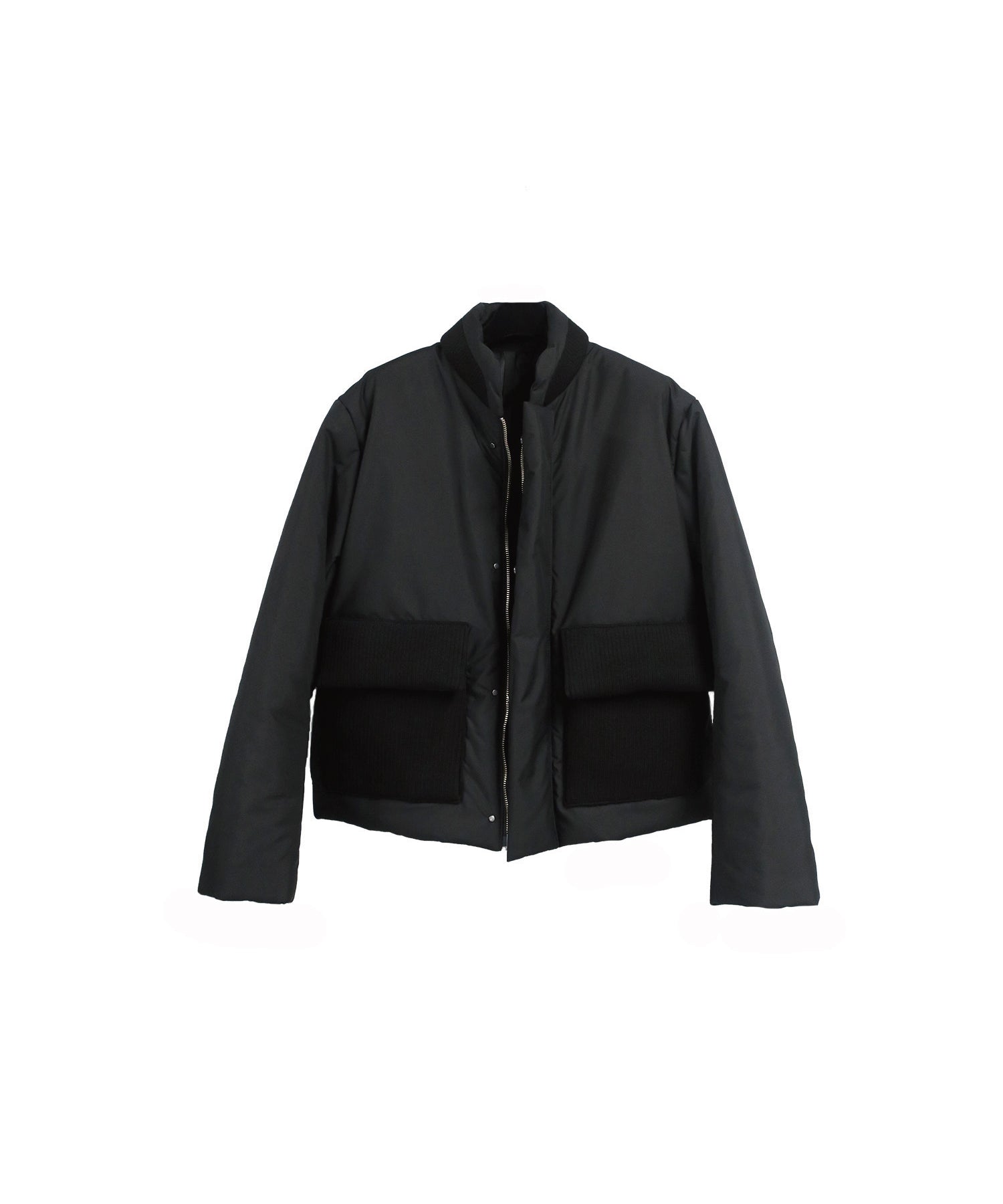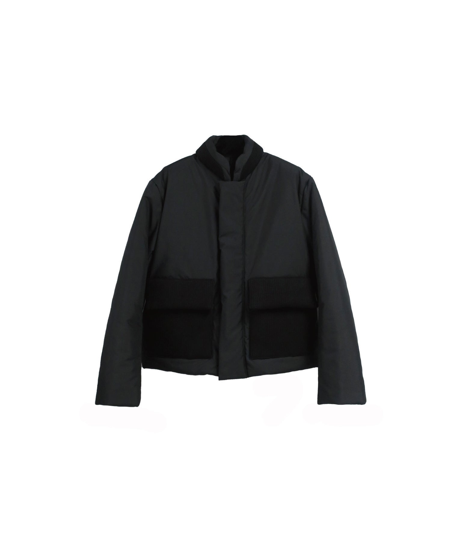 撥水、撥油、防汚加工を施したテフロン生地をベースに、ポケットとネックにリブニット生地を組み合わせた中綿入りブルゾン。軽量であたたかい。